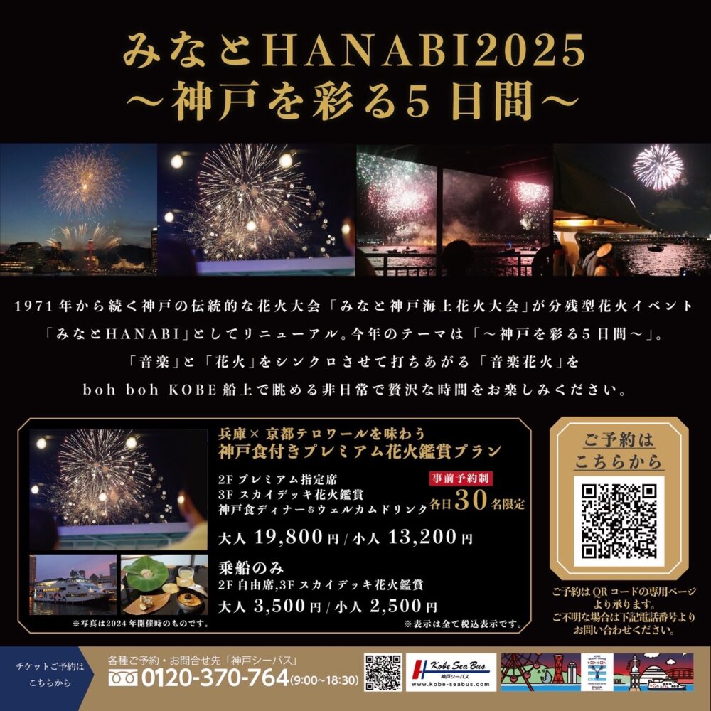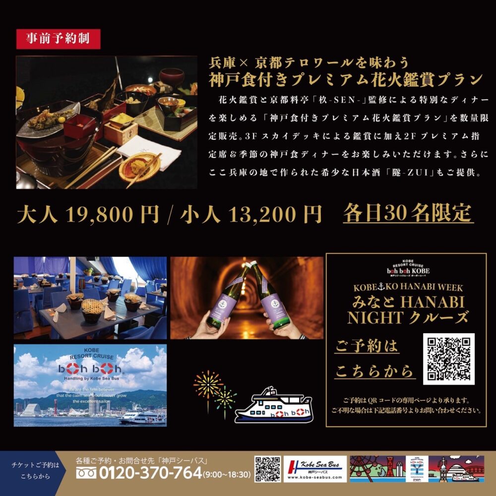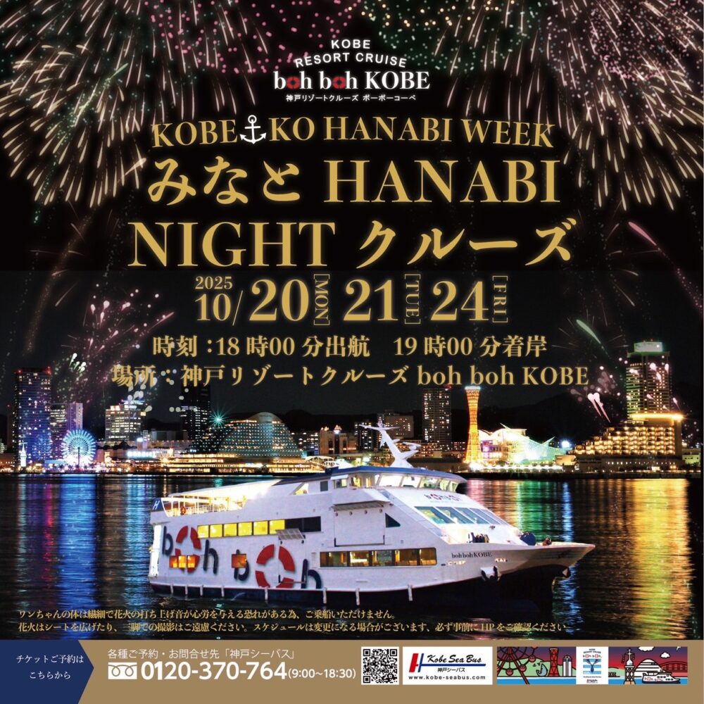 神戸シーバスboh boh KOBEは、10月20日(月)、21日(火)、24日(金)の3日間「神戸みなとHANABI NIGHTクルーズ」を開催いたします。boh boh KOBEの船上でしか味わえない神戸食と、神戸港の夜空に打ち上がる「音楽とシンクロした花火」とのマリアージュをご堪能ください。他にはない感動体験をぜひboh boh KOBEで。
