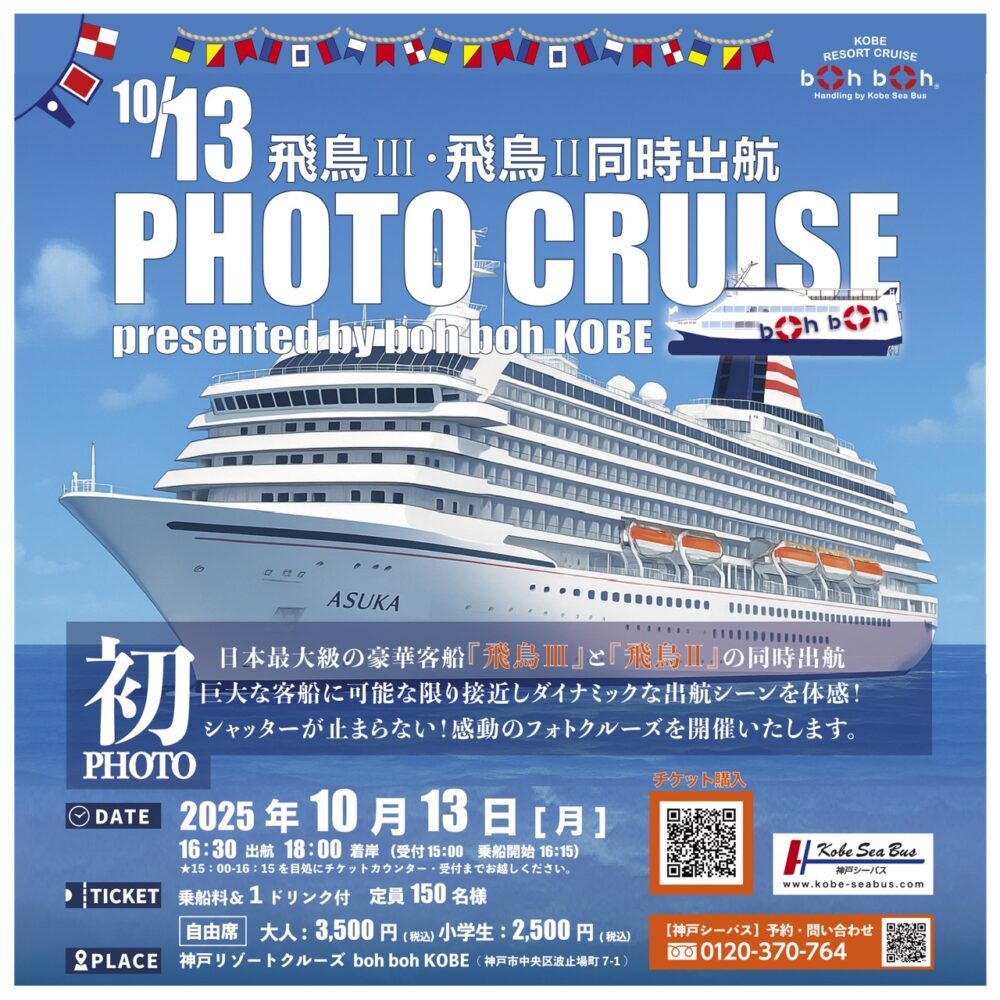 日本が誇る豪華客船『飛鳥Ⅲ』と『飛鳥Ⅱ』が神戸港より同時刻帯に出航し、boh boh KOBEでは船上より間近に『飛鳥Ⅲ』と『飛鳥Ⅱ』をご観覧いただけます。この貴重な機会にぜひご参加ください。