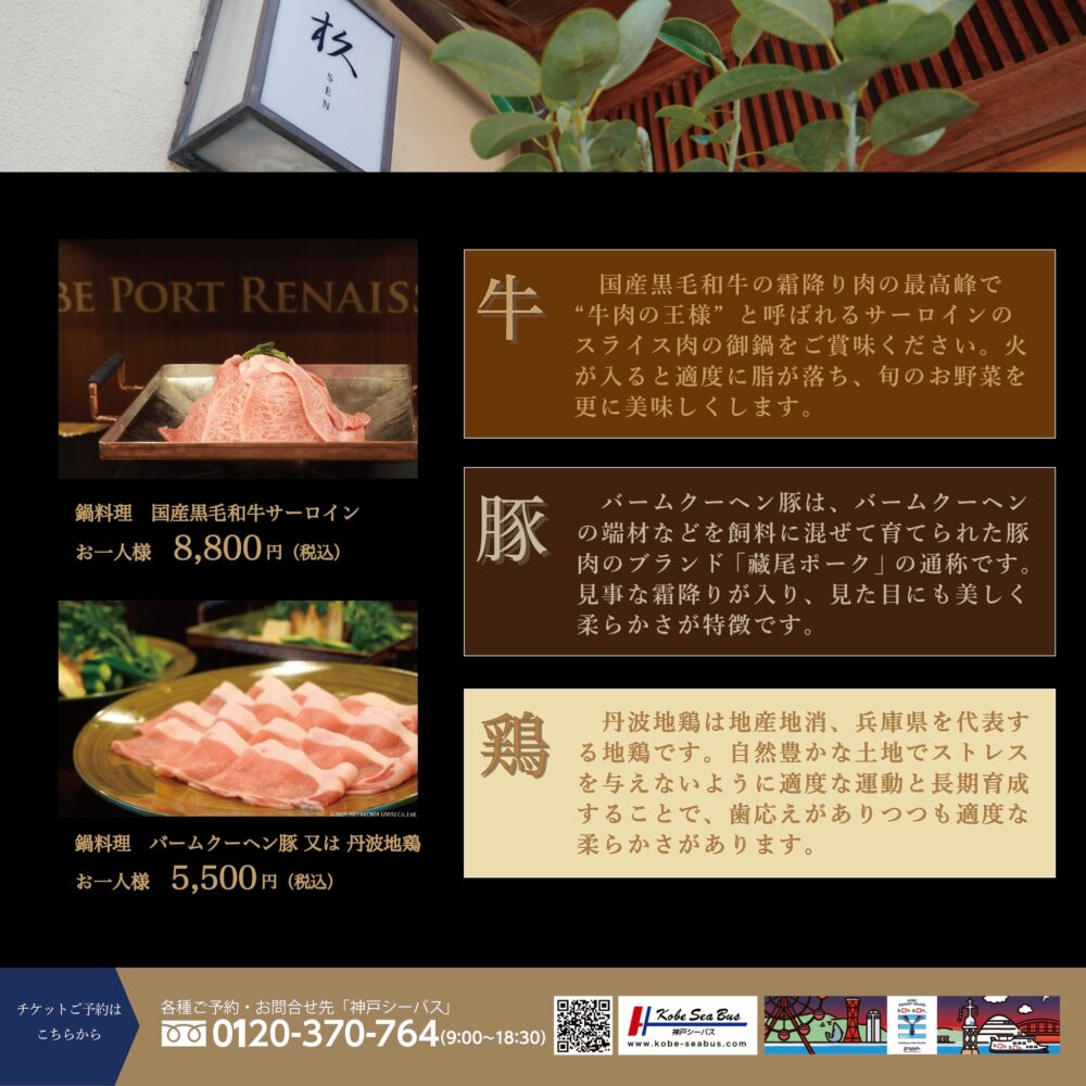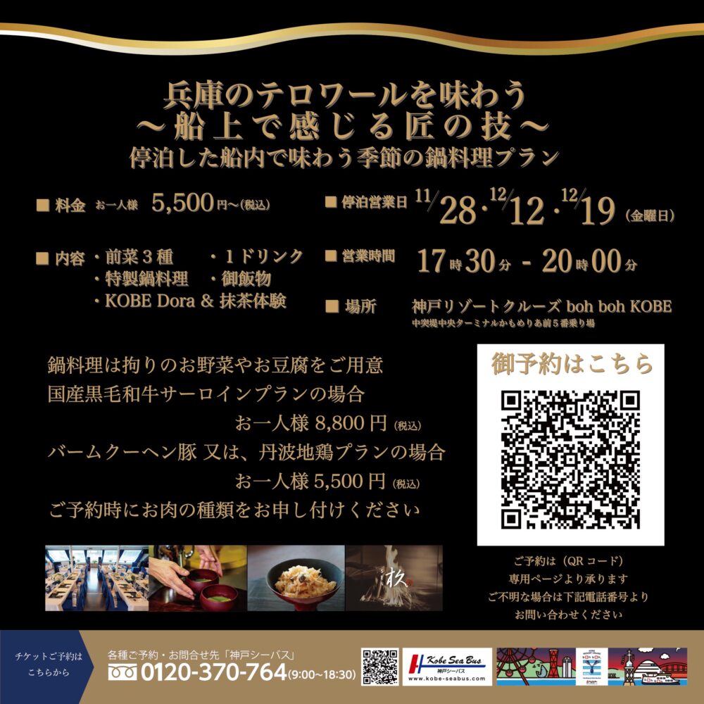 神戸シーバス boh boh KOBEでは11月28日(金)より、金曜日の停泊営業にて、兵庫×京都テロワールを味わう特別プラン『「杦」監修 鍋料理』を販売いたします!